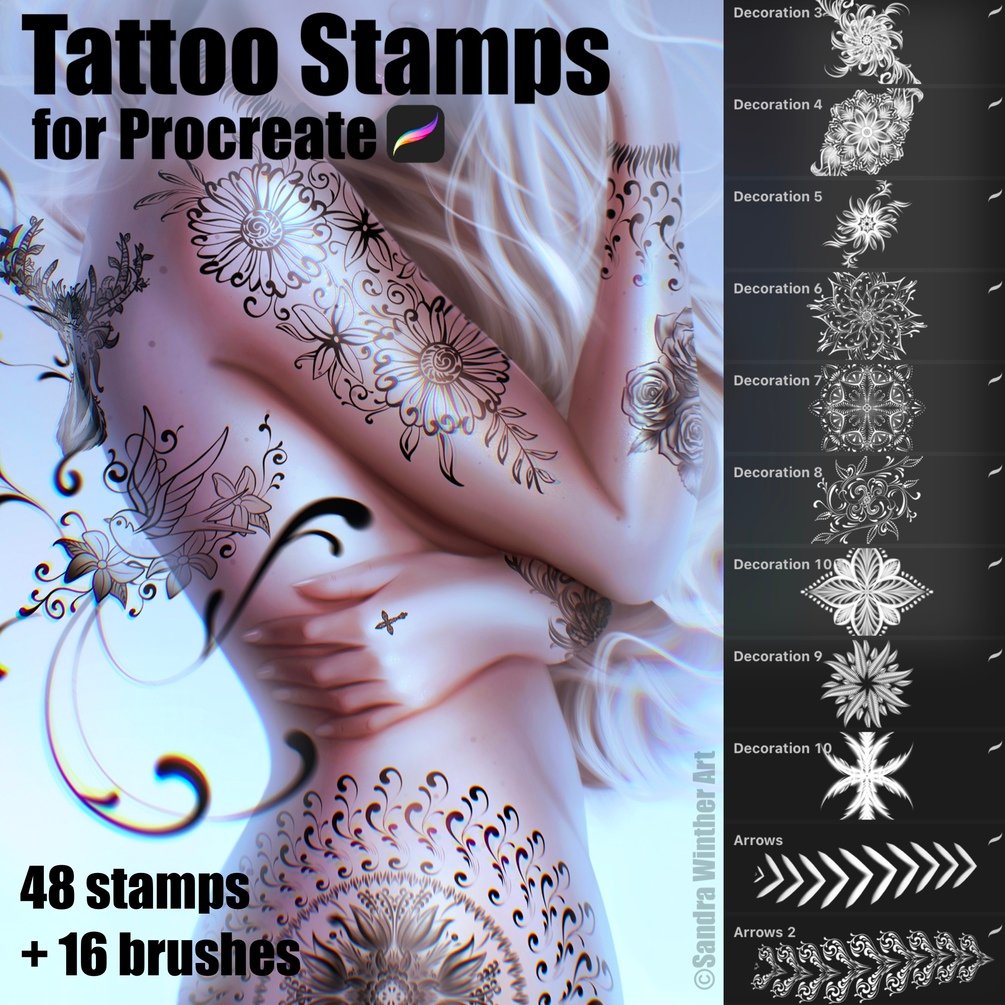 48 stamps + 16 brushes to easily add tattoos to your paintings.