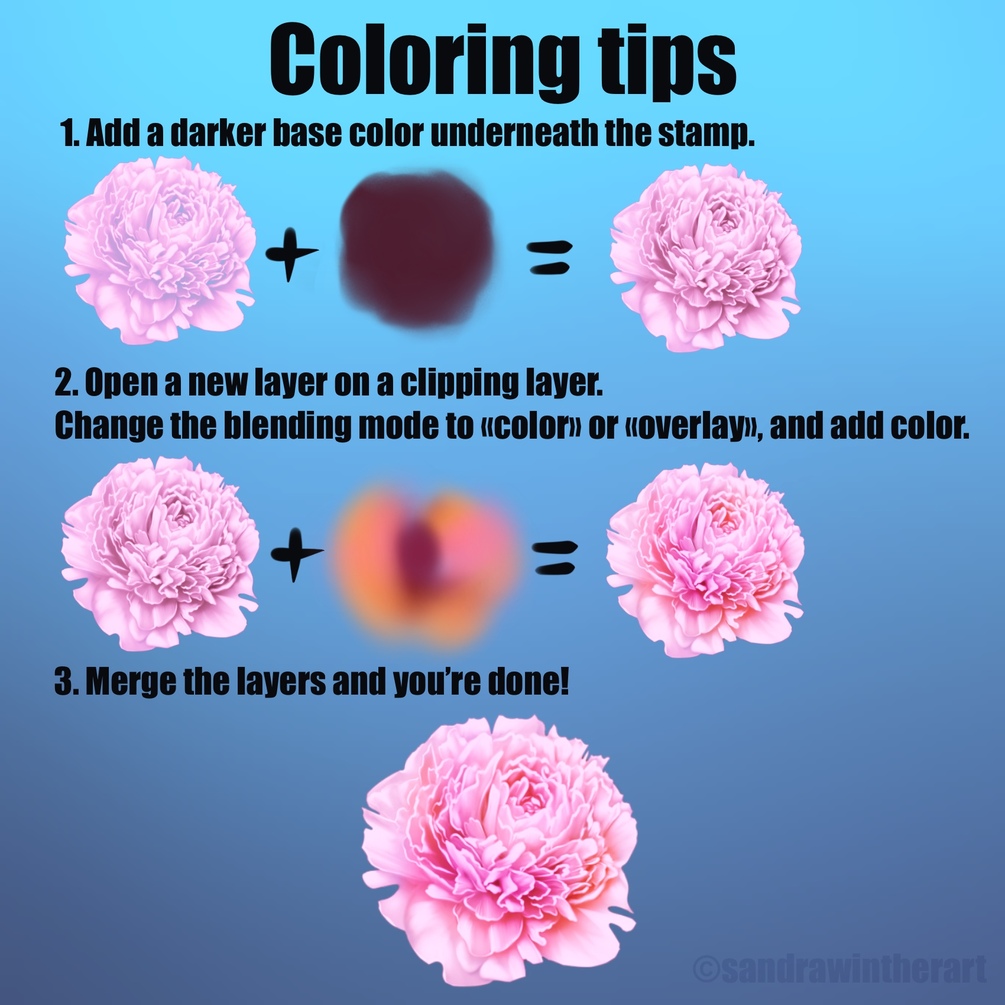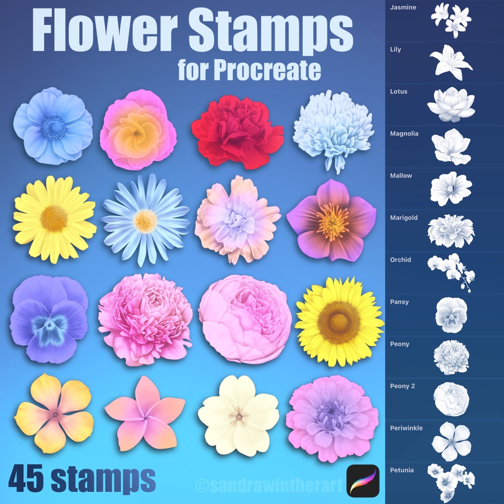 My 45 flower stamps, including many different types of flowers. Roses, peonies, daisies, poppies etc… You can look at what’s included in the preview images.